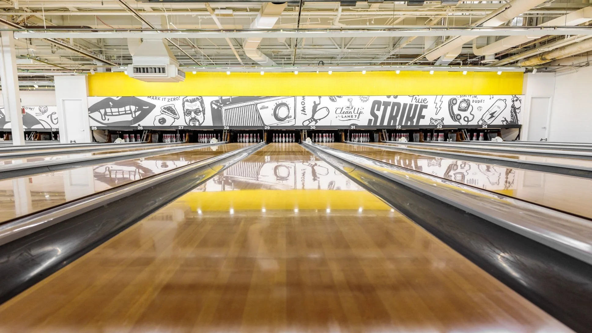 Radio Social is a bowling alley, restaurant, bar, music venue, and social club located in Rochester, New York’s historical Stromberg-Carlson warehouse. This commissioned mural spans entire back room (25 lanes).